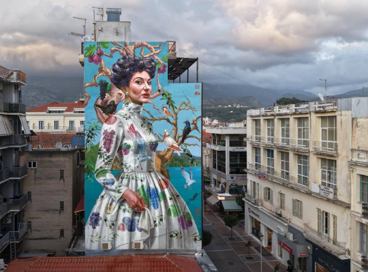 De enorme mural toont de figuur van de beroemde Griekse sopraan Maria Callas, tussen takken, vogels en vruchten. De afbeelding symboliseert de verbinding tussen mens en natuur – een relatie die in Messinia, en vooral in Kalamata, altijd levend en aanwezig is. Volgens Kostopoulos is het geen letterlijk portret van Callas, maar een allegorische weergave van de stad Kalamata zelf.
