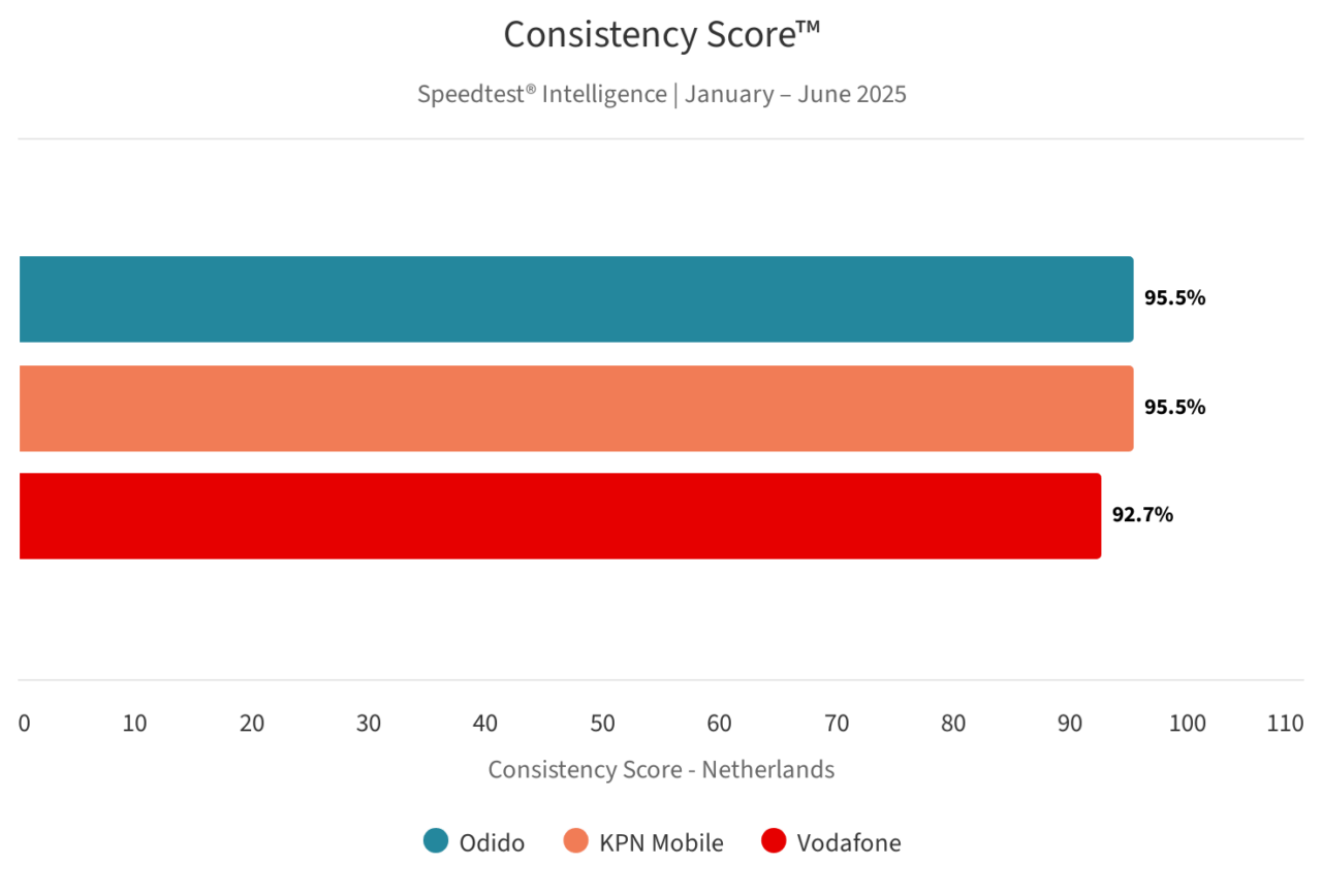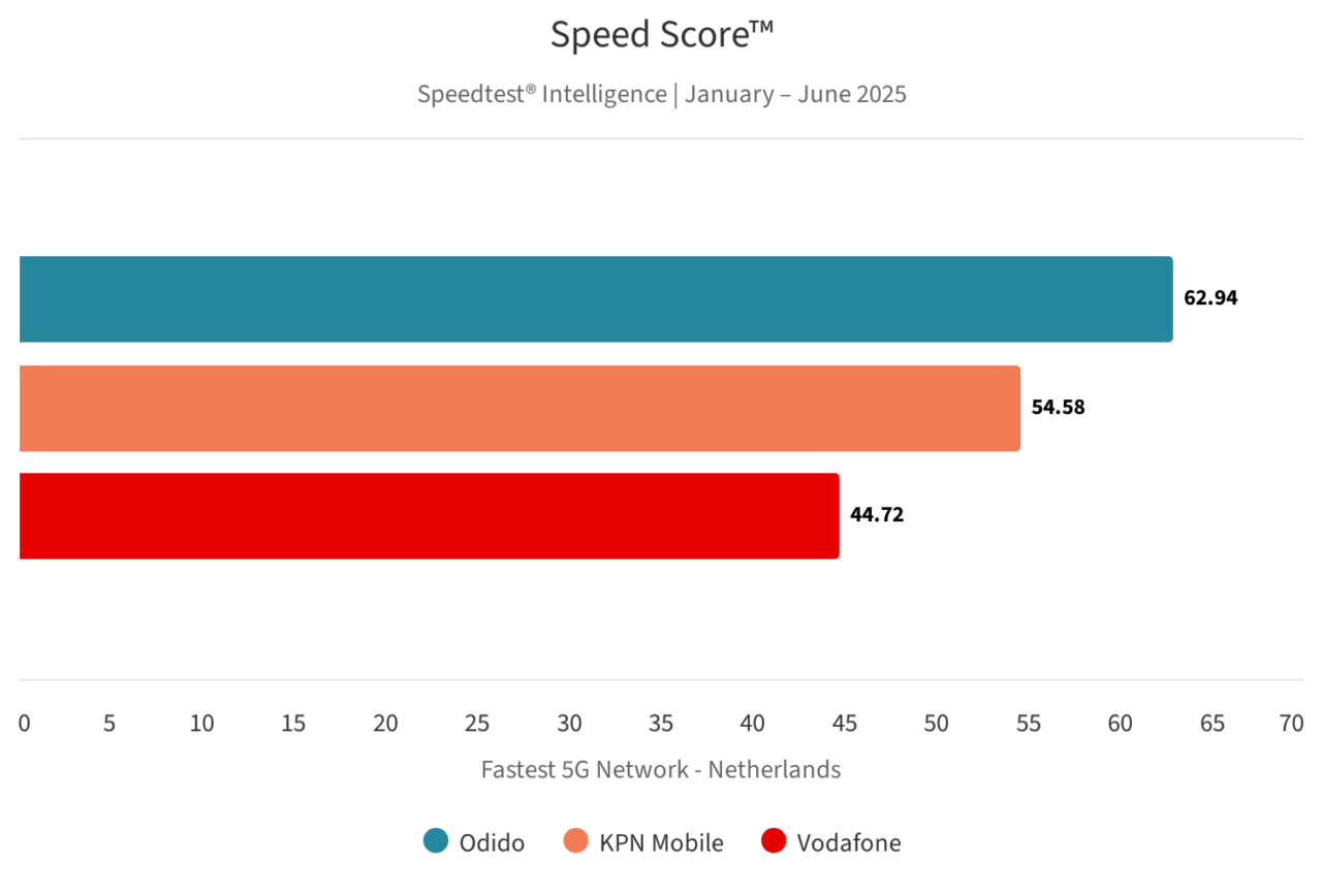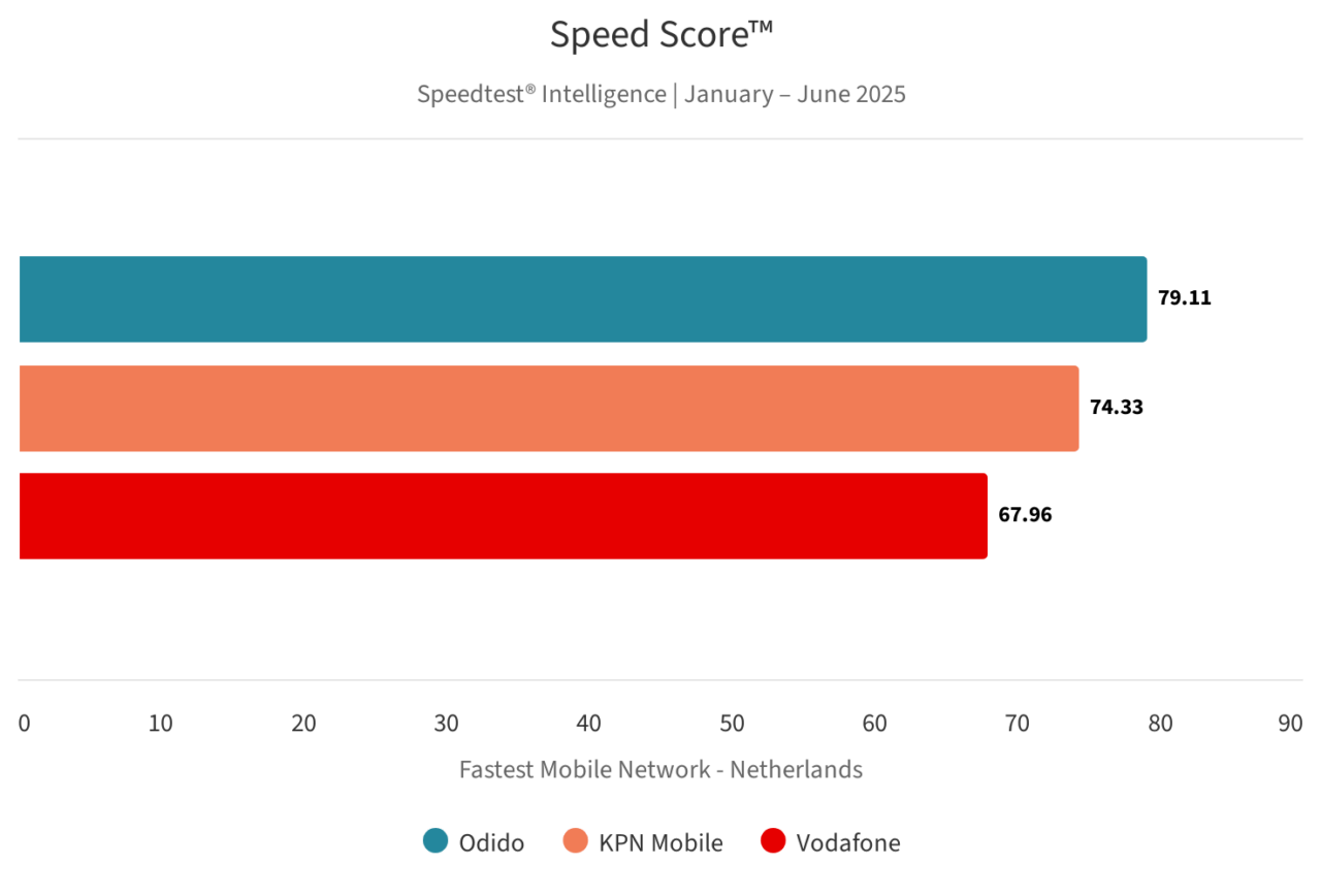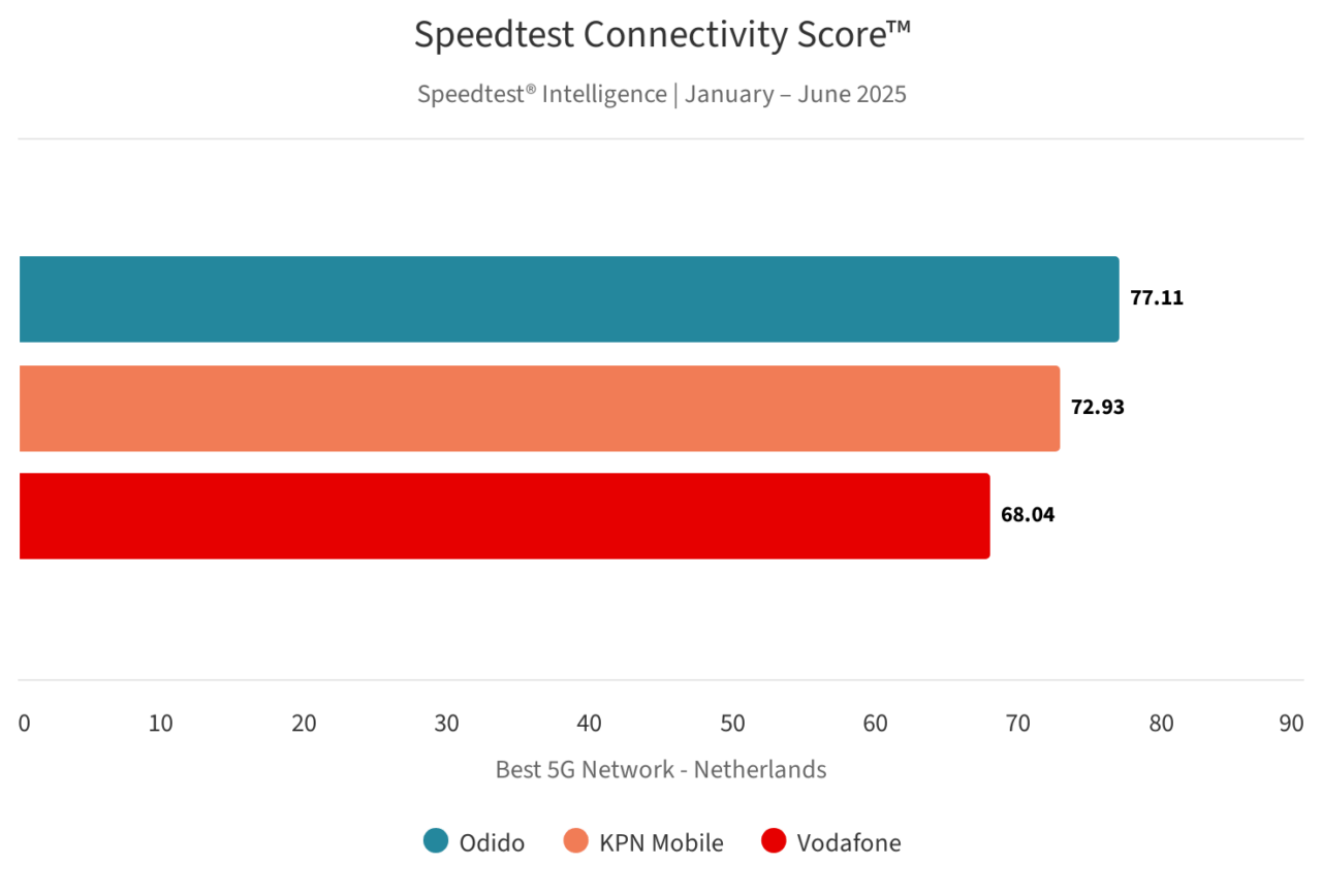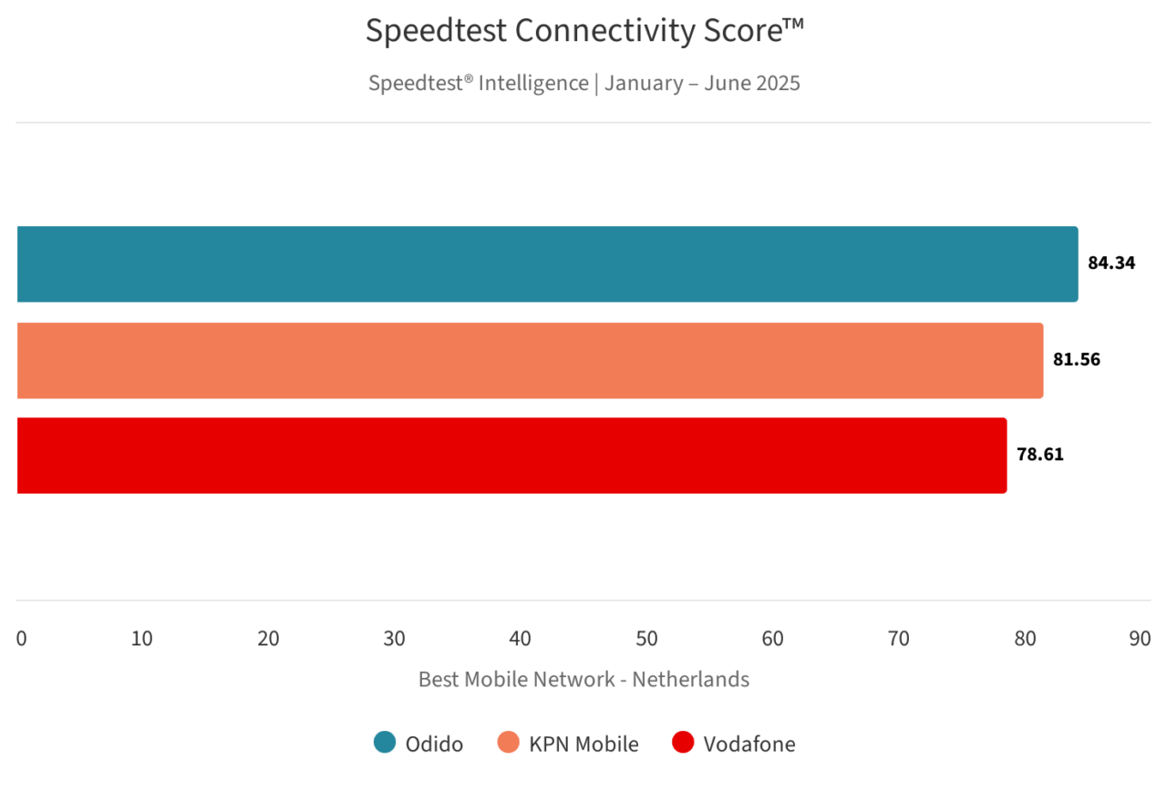Odido had in de eerste helft van 2025 in Nederland het beste mobiele netwerk, zowel in het algemeen als wat 5G specifiek betreft. De provider haalde een Speedtest Connectivity Score van 84,34 en een Speedtest 5G Connectivity Score van 77,11. De top 3 wordt vervolledigd door KPN Mobile en Vodafone.