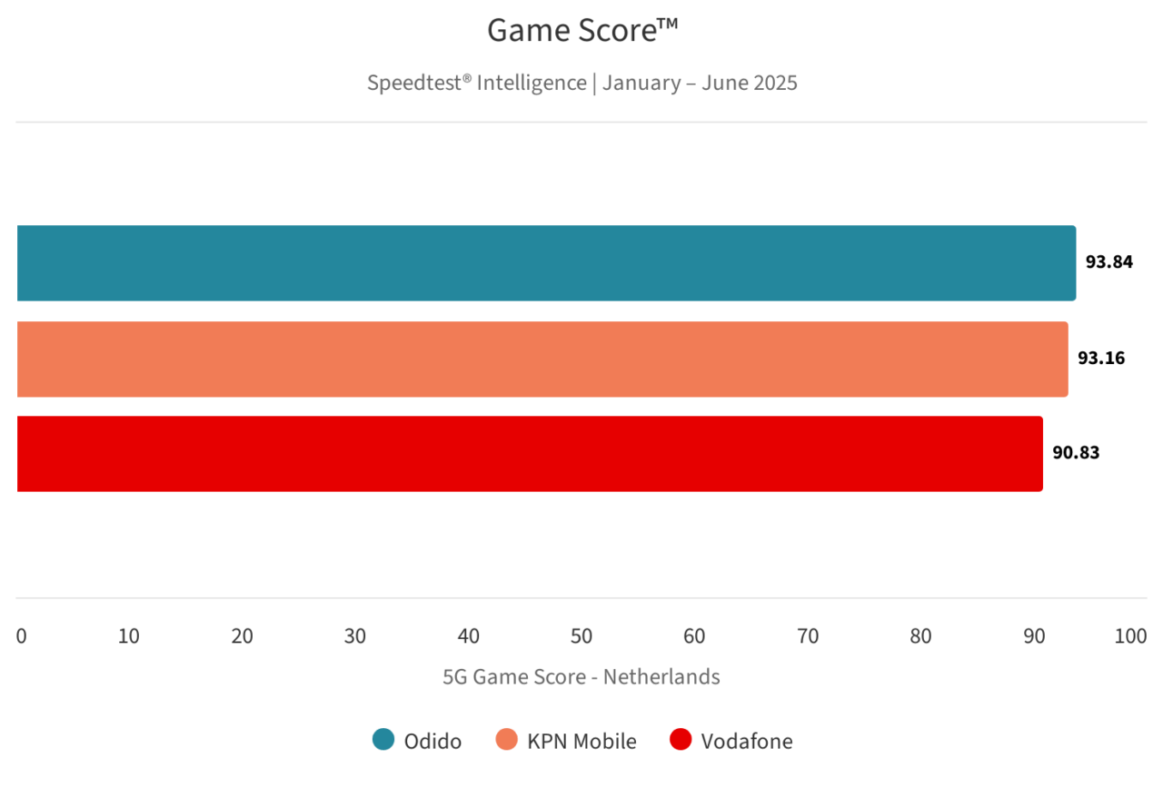 Ook voor gaming lagen de scores dicht bij elkaar, maar zowel in het algemeen als voor 5G deed Odido het net iets beter dan KPN Mobile en Vodafone. Voor deze score wordt gekeken naar zaken als snelheid, latency en andere parameters die voor gamers belangrijk zijn.