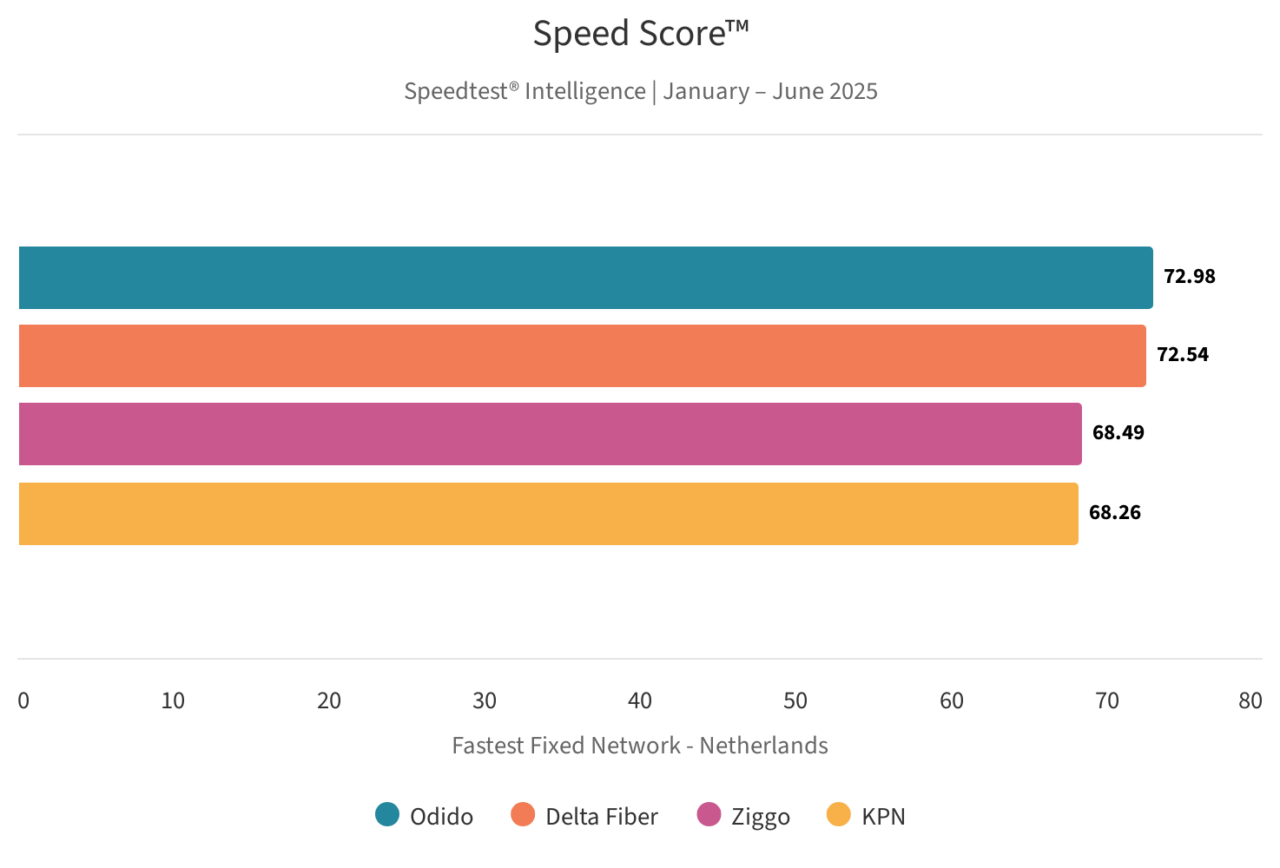 In de eerste helft van 2025 had Odido het beste vaste netwerk van alle internetproviders in Nederland, gevolgd door Delta Fiber, Ziggo en KPN, al liggen de scores wel dicht bij elkaar. De Connectivity Score die gebruikt wordt, houdt rekening met verschillende andere scores, waaronder die van de snelheid, het streamen van video’s en de algemene surfervaring.