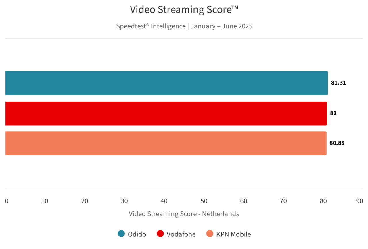 Voor het streamen van video’s via een vast netwerk liggen de scores opnieuw dicht bij elkaar, al deed Odido het net iets beter dan de rest. Voor deze score wordt gekeken naar zaken als starttijd, buffering en resolutie.
