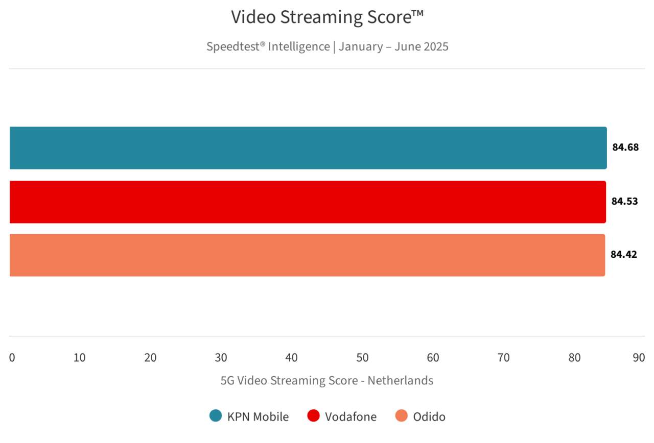 Voor het streamen van video’s scoorde Odido net iets beter dan Vodafone en KPN Mobile. Voor het streamen van video’s via 5G waren de verschillen verwaarloosbaar. Voor deze score wordt gekeken naar zaken als starttijd, buffering en resolutie.