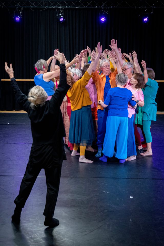 De vier uren van repeteren stellen hoge eisen. Lotta vraagt nooit of de deelnemers een bepaalde oefening kunnen, sommige bewegingen vereisen elastische ledematen. Die hebben we niet meer, of minder. Ze maakt een gimmick van die ouderdomspijn. In een scène moeten we ons bewegen alsof heup of bovenbeen getroffen worden door een aanval van jicht en stekende pijnscheuten. We lopen krom en kreupel als echte oudjes in een karikatuur. Geweldige act. Humor en harde werkelijkheid ineen.