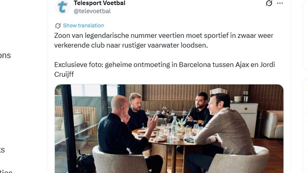 Ajax is in gesprek met Jordi Cruijff over de functie van technisch directeur. Dat bevestigt Cruijff aan de NOS, na eerdere berichtgeving van AD en De Telegraaf. Die laatste krant publiceerde een foto van Cruijff aan tafel met een delegatie van Ajax in Barcelona.