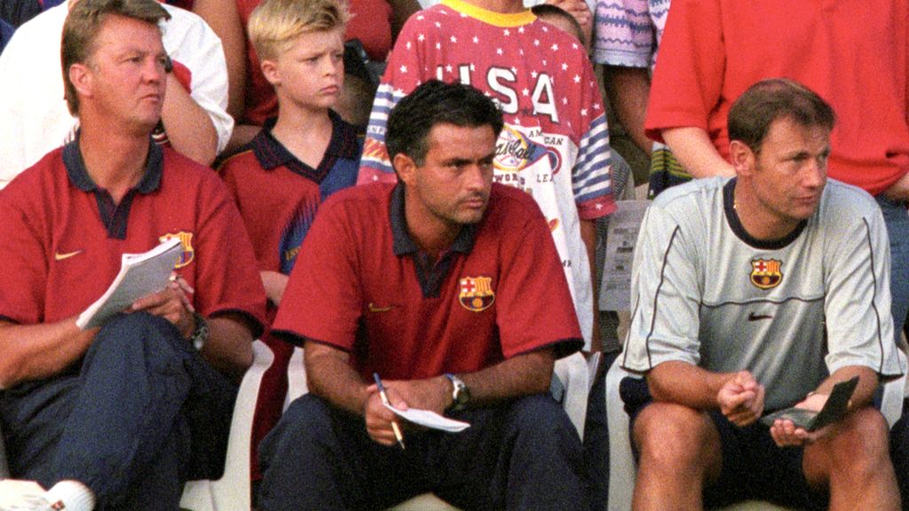 GettyJosé Mourinho naast Louis van Gaal op de bank tijdens een oefenduel in 1999 tegen een regioteam uit Wageningen (uitslag: 12-0)
