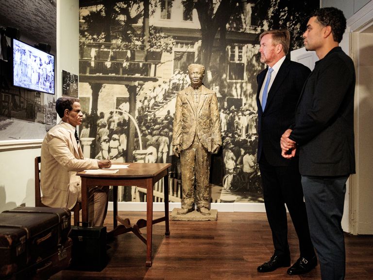 ANPDe koning bij een beeld van schrijver, antikoloniaal activist en verzetsheld Anton de Kom