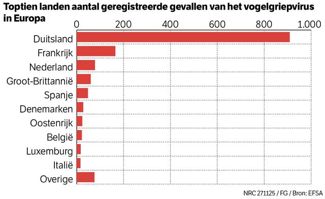 Het hoge aantal besmettingen onder wilde vogels, betekent een bedreiging voor de pluimveehouderij. Vogelgriep weet regelmatig stallen binnen te dringen, met de ruiming van honderdduizenden kippen en kuikens tot gevolg – al meer dan een miljoen sinds 6 oktober. „De sprong naar commerciële bedrijven gebeurt vaak dit jaar”, zegt Ballmann. En haar valt nog iets op: het virus zit niet geclusterd in brandhaarden, maar is in wilde vogels in álle hoeken van het land te vinden.