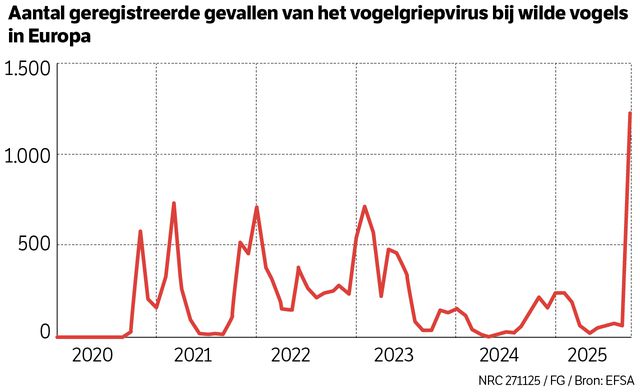 Sinds het begin van dit vogelgriepseizoen, in september, meldde EFSA ruim 1.400 besmettingen onder dood aangetroffen wilde vogels. Dat is meer dan ooit en zelfs twee keer zoveel als in dezelfde periode in rampjaar 2022, toen in totaal 76 Nederlandse pluimveebedrijven geruimd moesten worden.