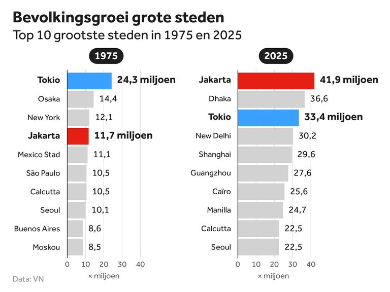 Jakarta is Tokio gepasseerd als de grootste stad ter wereld. In de Indonesische hoofdstad wonen 42 miljoen mensen, blijkt uit een nieuwe telling van de Verenigde Naties. In Tokio zijn dat er 33 miljoen.