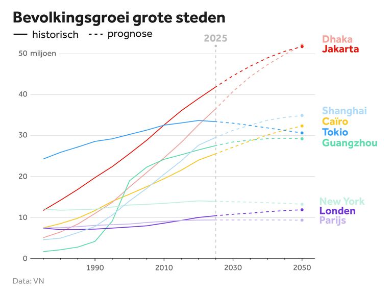 Ook Dhaka is Tokio voorbij op de lijst. De hoofdstad van Bangladesh heeft 37 miljoen inwoners. De VN verwacht Dhaka halverwege deze eeuw ook Jakarta passeert. Tokio zal dan door bevolkingskrimp als gevolg van vergrijzing naar de zevende plaats zijn gezakt. Dan wonen daar naar verwachting 31 miljoen mensen.