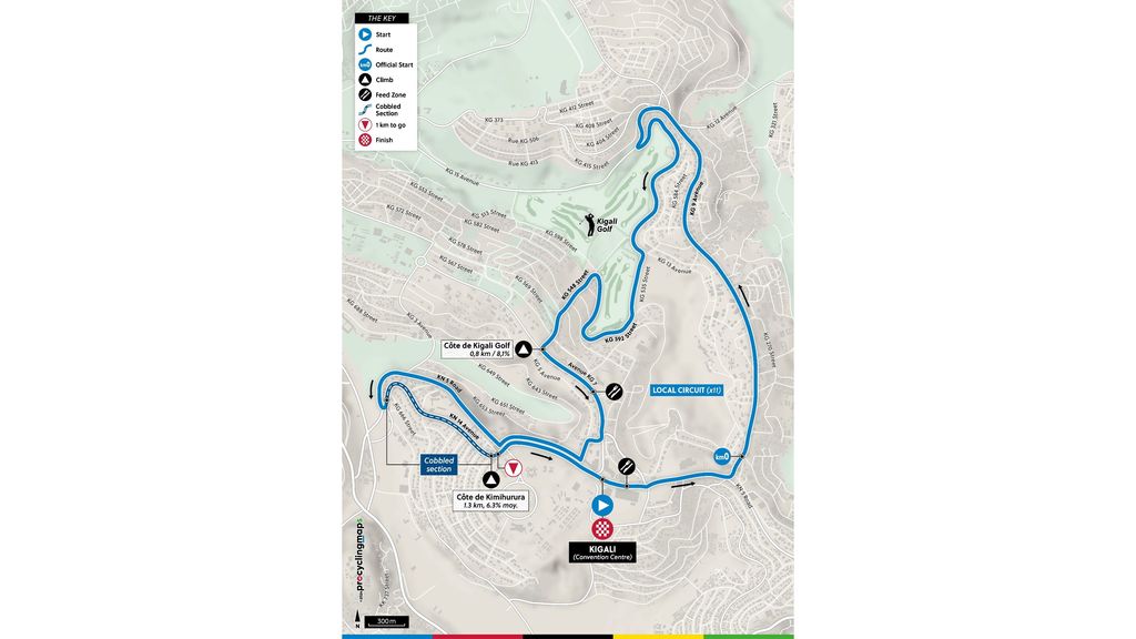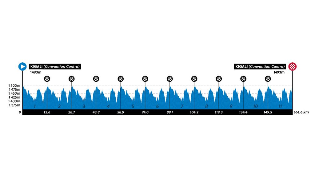 Lastigste punten op dat stadsparcours waren de Côte de Kimihurara, een kasseienklim van 1,3 kilometer die gemiddeld 6,3 procent stijgt, en de Côte de Kigali, een 800 meter lange ‘muur’ met een gemiddelde stijging van 8,1 procent.