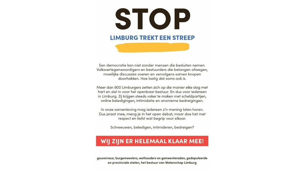 Burgemeesters, wethouders en andere bestuurders in Limburg vragen aandacht voor de dreigementen en intimidatie waarmee ze te maken hebben. “Stop. Limburg trekt een streep”, staat boven een grote advertentie die onder meer is geplaatst in De Limburger. “Schreeuwen, beledigen, intimideren, bedreigen? Wij zijn er helemaal klaar mee.”