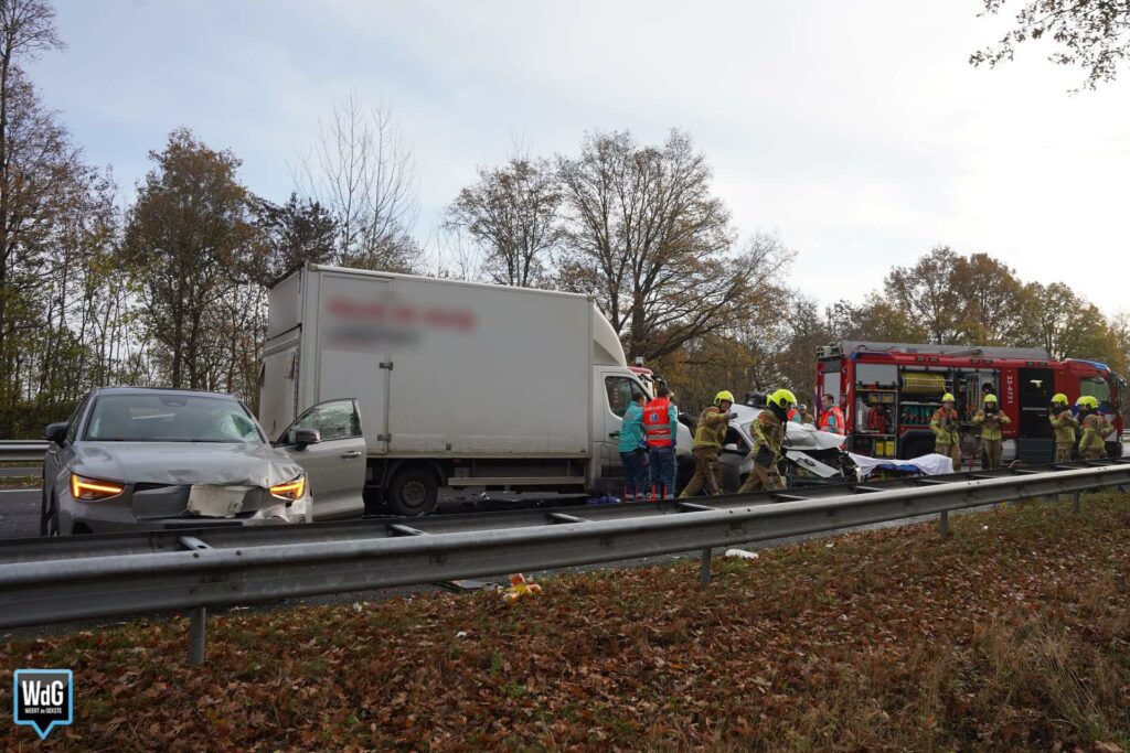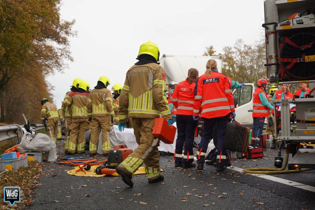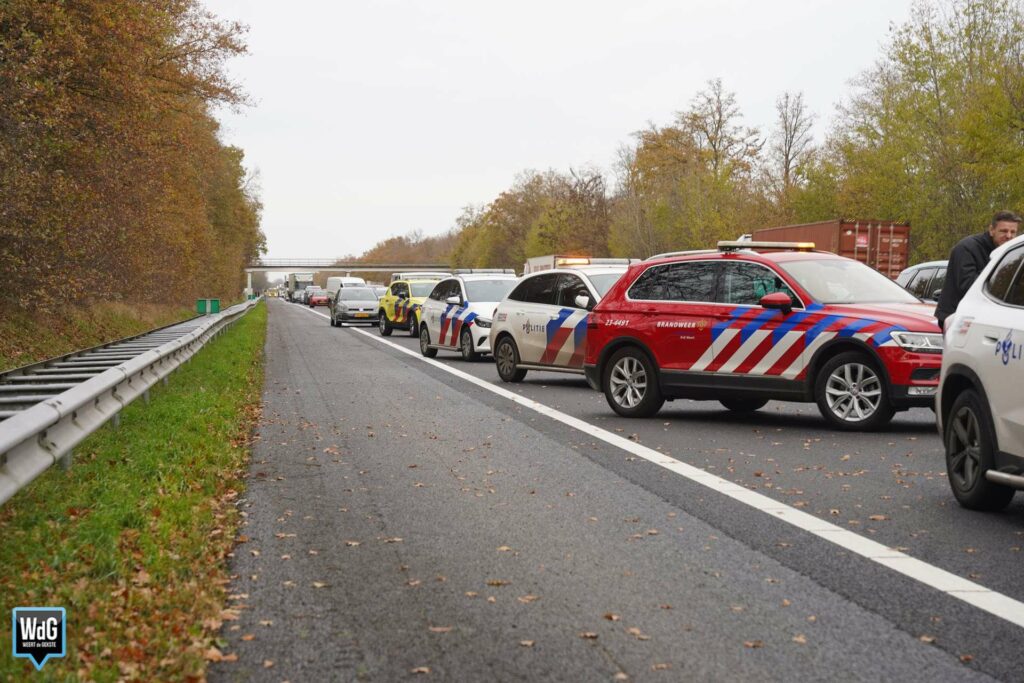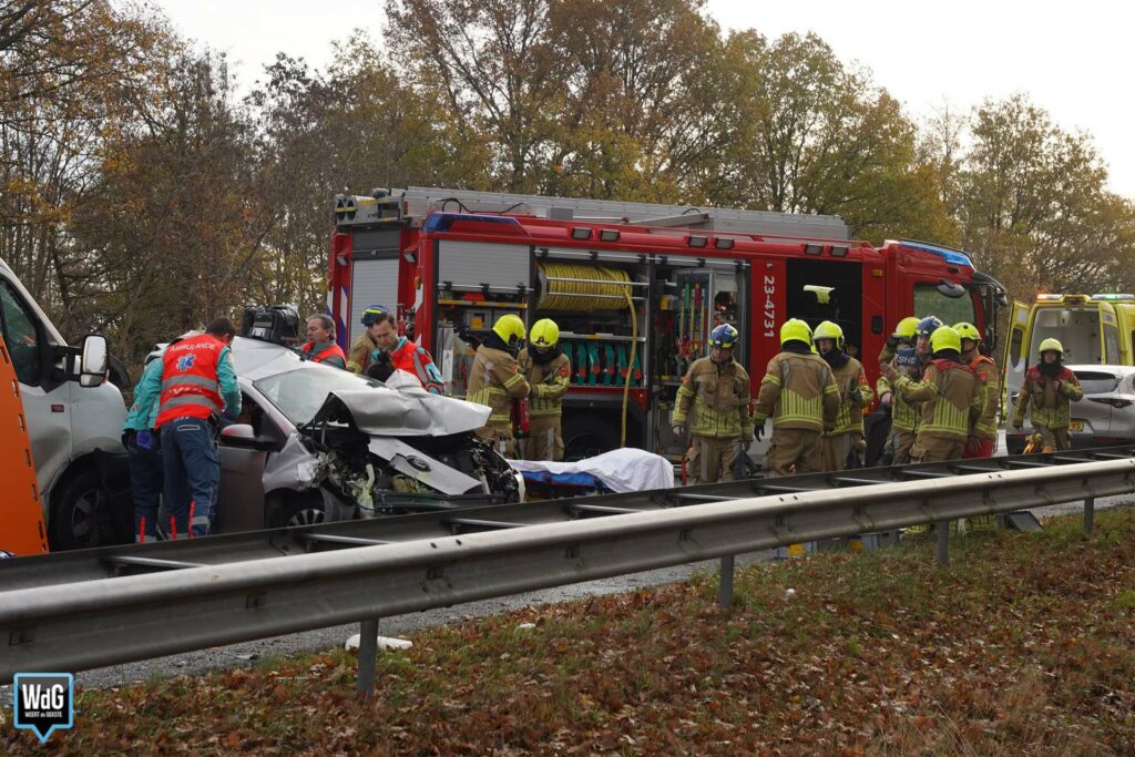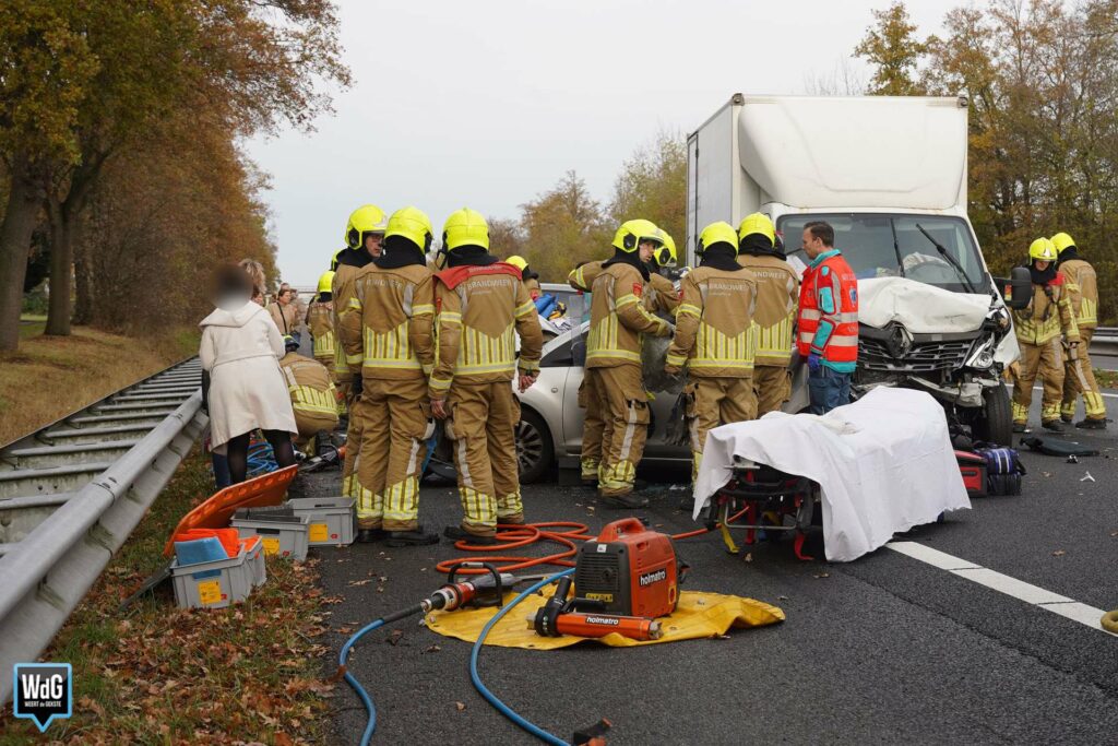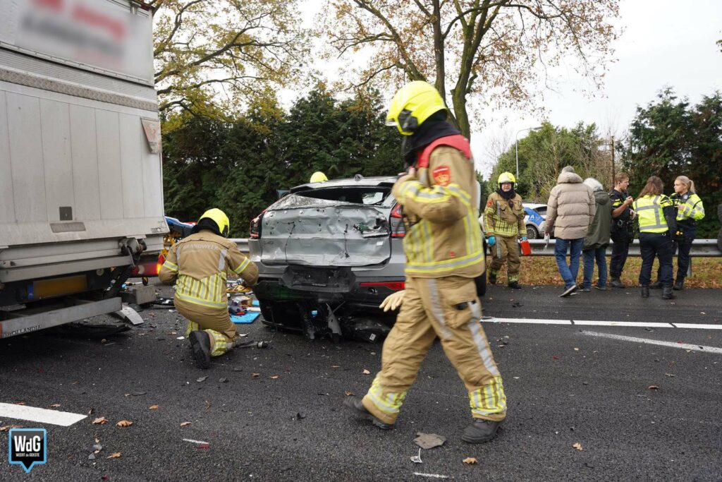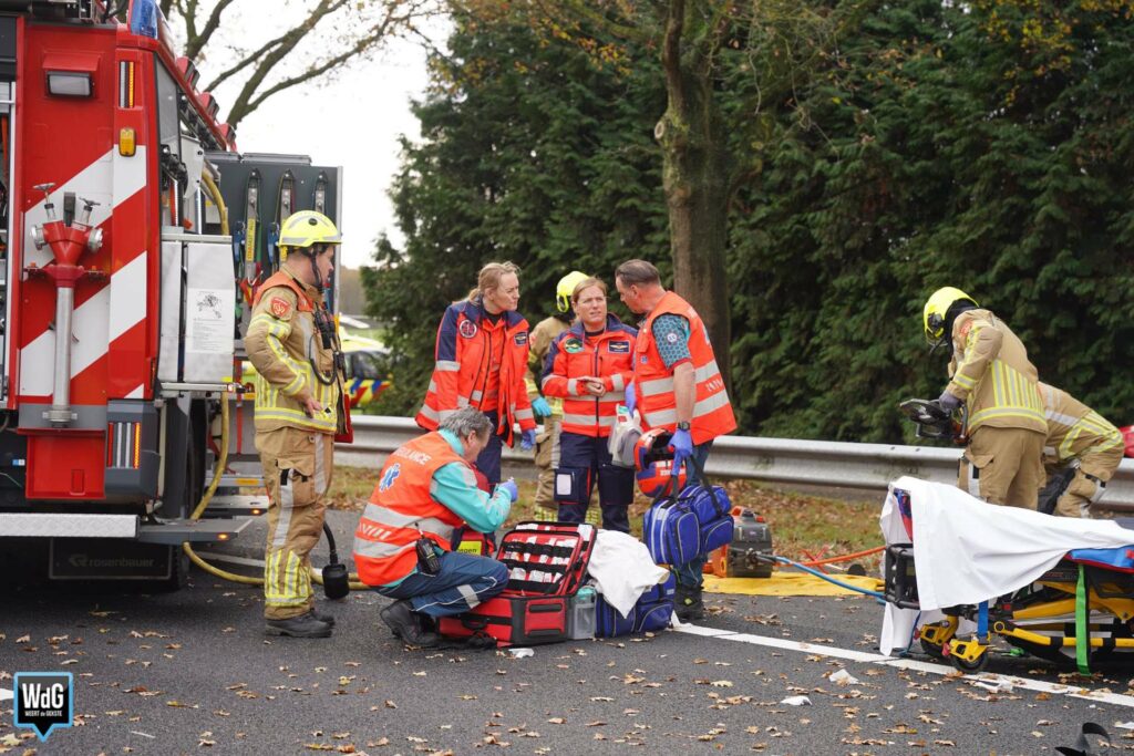 Update – In totaal zijn drie personen naar het ziekenhuis overgebracht. Even verderop ontstond een tweede ongeval door de file die door de aanrijding was ontstaan. De snelweg is in zuidelijke rijrichting nog altijd afgesloten.
