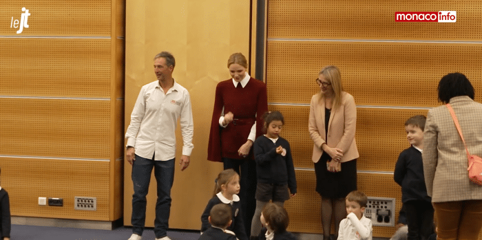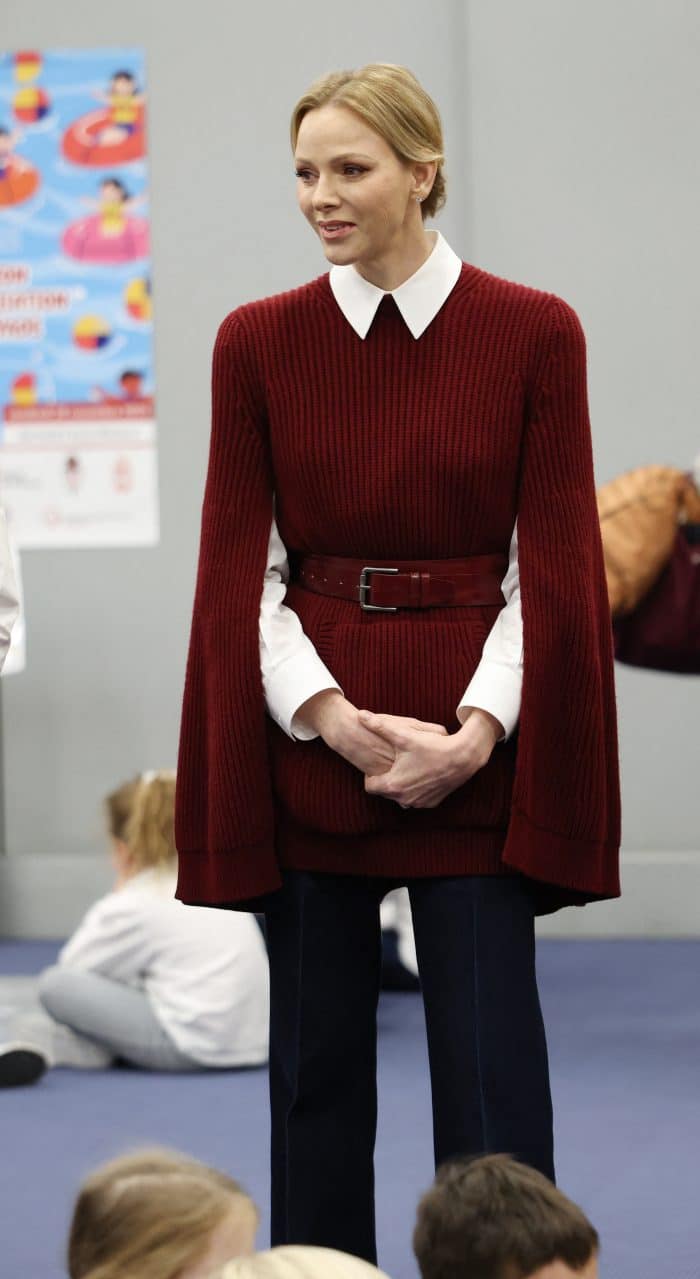 Namens haar stichting bezochtprinses Charlène het Grimaldi Forum om een ​​bewustmakingscampagne te voeren over verdrinken onder 6-jarige kinderen van scholen in Monaco. Wat een elegante dame staat hier, in een zwarte broek, witte blouse, met een wijnrode trui met openvallende mouwen, die Charlène als soort capemantel draagt. De trui en de riem zijn afkomstig van MaxMara.