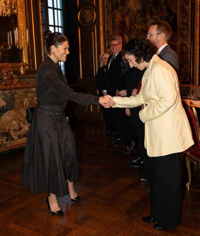 Kroonprinses Victoria was samen met haar vader aanwezig bij een vergadering van de Informatieraad in het Koninklijk Paleis. Daarbij droeg ze een zwarte midirok (label: H&M), een zwarte top en een zwart truitje.