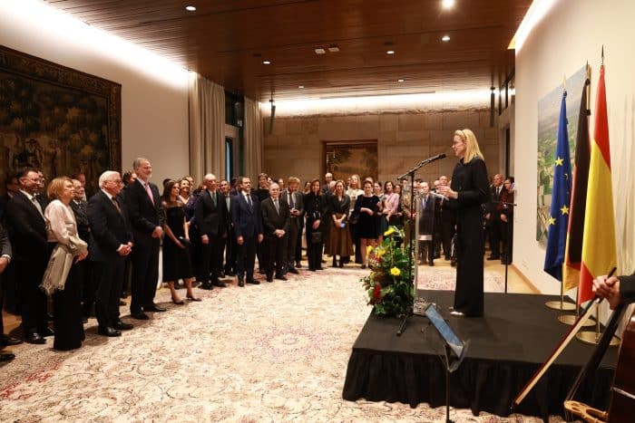 Tijdens de tweede dag van het staatsbezoek waren alleen de koning en president Steinmeier aangekondigd. Koningin Letizia en de first lady waren er echter bij de receptie ’s avonds wél bij aanwezig. Letizia droeg een zwarte cocktailjurk, met soort visnet aan de bovenzijde, dat bij de mouwen uitloopt in losse franjes (label: Hugo Boss).