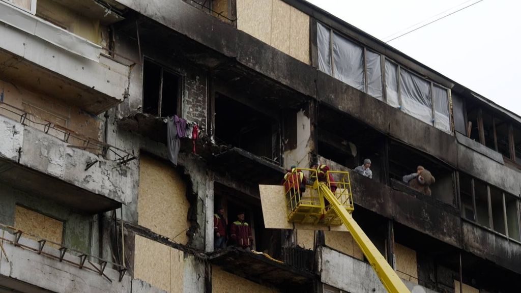 Binnen op de zevende verdieping zijn Irina en haar man Taras een uitgebrand appartement aan het leegruimen. Zwartgeblakerd keukengerei en andere huisraad verdwijnen in een grote vuilniszak. De buitenmuur is grotendeels verwoest.