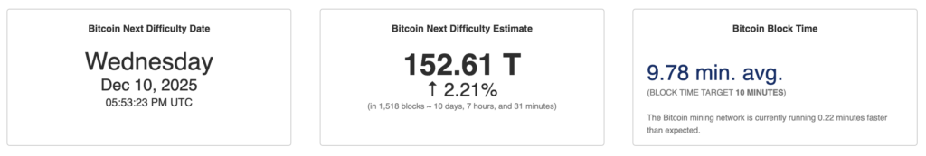 Rond 10 december past Bitcoin die moeilijkheidsgraad weer aan. Hij gaat dan een klein beetje omhoog. Dat betekent dat miners iets harder moeten werken om een nieuw blok te vinden. De vorige keer ging de moeilijkheidsgraad juist omlaag, waardoor blokken iets sneller werden gevonden dan gepland. Gemiddeld lag de tijd toen op ongeveer 9,78 minuten en dat hoort eigenlijk tien minuten te zijn.