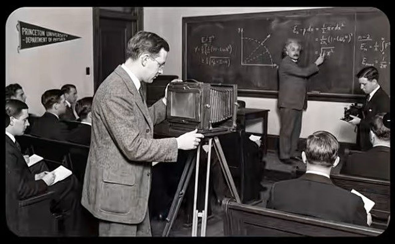 Is dit een historische scène waarin Albert Einstein lesgeeft, waarbij een fotograaf aanwezig is om dit vast te leggen?