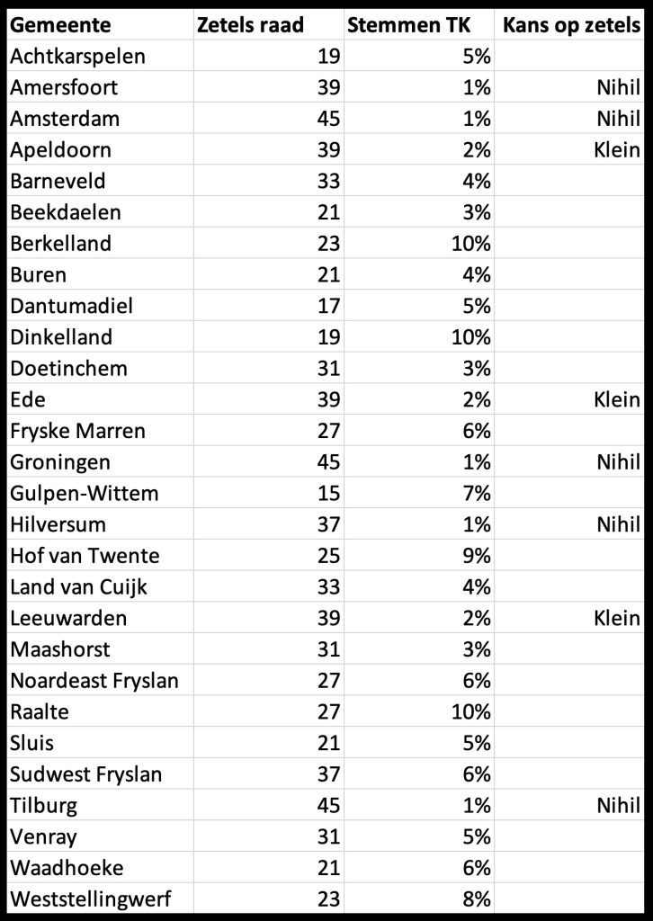 In dit overzicht staat het aantal zetels van de gemeenteraden van de betreffende gemeenten. In Amsterdam en Groningen zijn er 45 zetels en daardoor is de kiesdrempel procentueel laag: zo’n twee procent. In kleine gemeenten zoals Gulpen-Wittem is de gemeenteraad veel kleiner en is de kiesdrempel daarom procentueel veel hoger: onder de vijf procent van de stemmen ben je sowieso kansloos. Achter het aantal zetels staat het percentage stemmen op BBB bij de laatste verkiezingen voor de Tweede Kamer.