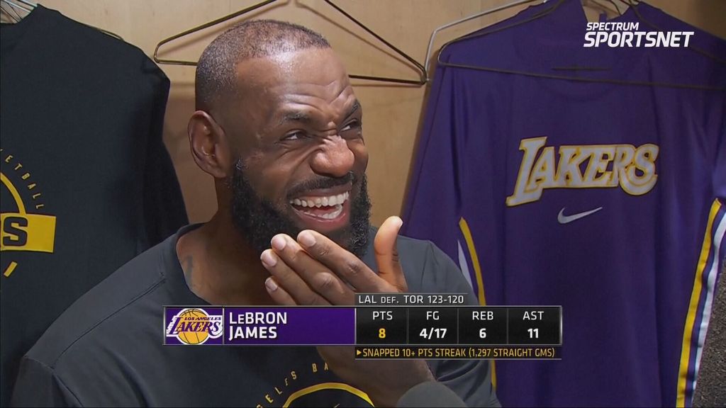 LeBron James komt geregeld in het nieuws als hij weer een nieuw record heeft gevestigd, maar vannacht is er voor de 40-jarige basketballer juist een einde gekomen aan een recordreeks. Hij maakte namelijk slechts acht punten bij de overwinning van zijn LA Lakers op Toronto Raptors.