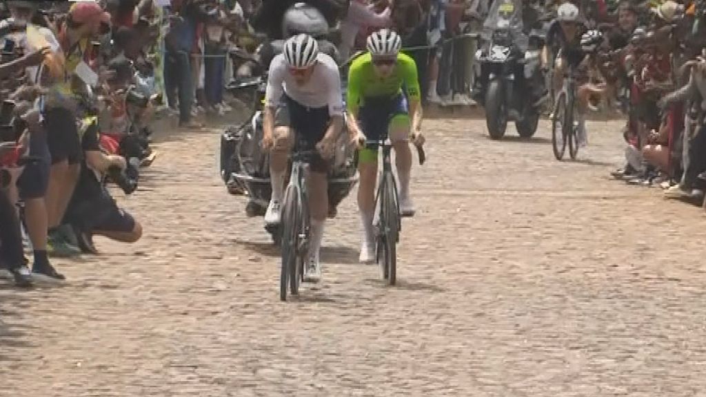 Evenepoel kon bergop niet aanhaken, de Mexicaan Isaac Del Toro maakte wel de oversteek naar het duo Pogacar en Ayuso. Op de korte maar steile kasseienklim die volgde, haakte Ayuso af bij de kopgroep.