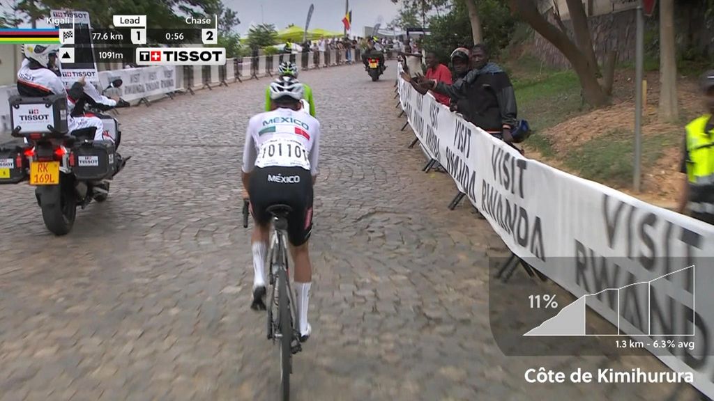 Het peloton dunde vooral op het laatste deel, dat loodzwaar was met stijgingspercentages die de twintig aantikten, flink uit. Pogacar greep de laatste meters van de berg aan om weg te rijden bij zijn concurrenten. Net als bij de WK van vorig jaar was dat op ruim honderd kilometer van de finish.