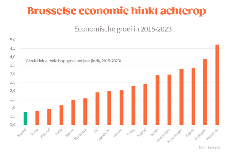 Vandaag is Brussel ‘goed’ voor een zesde van de economische activiteit in België. En dat is eigenlijk veel te weinig. In de meeste andere Europese landen is het gewicht van de hoofdstad in de hele economie veel groter (gemiddeld 28%). Bovendien neemt die achterstand nog toe: sinds 2015 groeide de economische activiteit in het Brussels Hoofdstedelijk Gewest met 0,7% per jaar, de laagste groei onder de Europese hoofdsteden. Dat suggereert dat we in Brussel heel wat economisch potentieel laten liggen. Dat wordt bevestigd door andere indicatoren. In 2024 was amper 64% van de Brusselse 20- tot 64-jarigen aan het werk. Dat is bij de laagste onder alle Europese regio’s. In de andere Europese hoofdsteden is dat gemiddeld bijna 80%. Dat impliceert dus een belangrijk onbenut arbeidspotentieel.