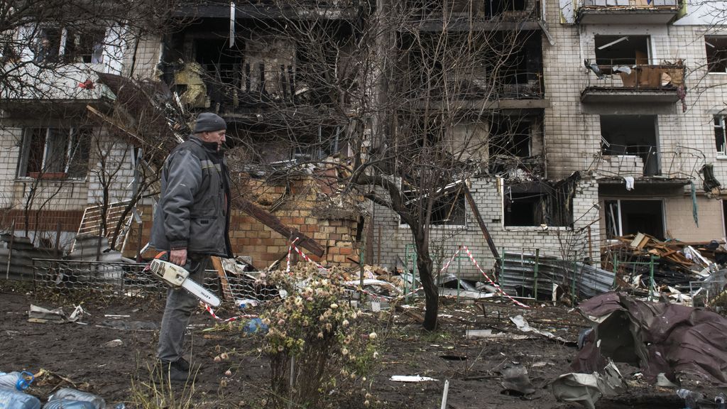 EPAEen man loopt langs een flat die is beschadigd door Russische drone-aanvallen, in de Kyiv-regio
