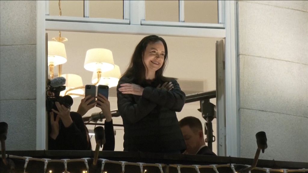 De Venezolaanse oppositieleider en Nobelprijswinnaar Maria Corina Machado is na maandenlang ondergedoken te zijn geweest weer in het openbaar verschenen. Vanaf een balkon van haar hotel in Oslo zwaaide ze naar het publiek.