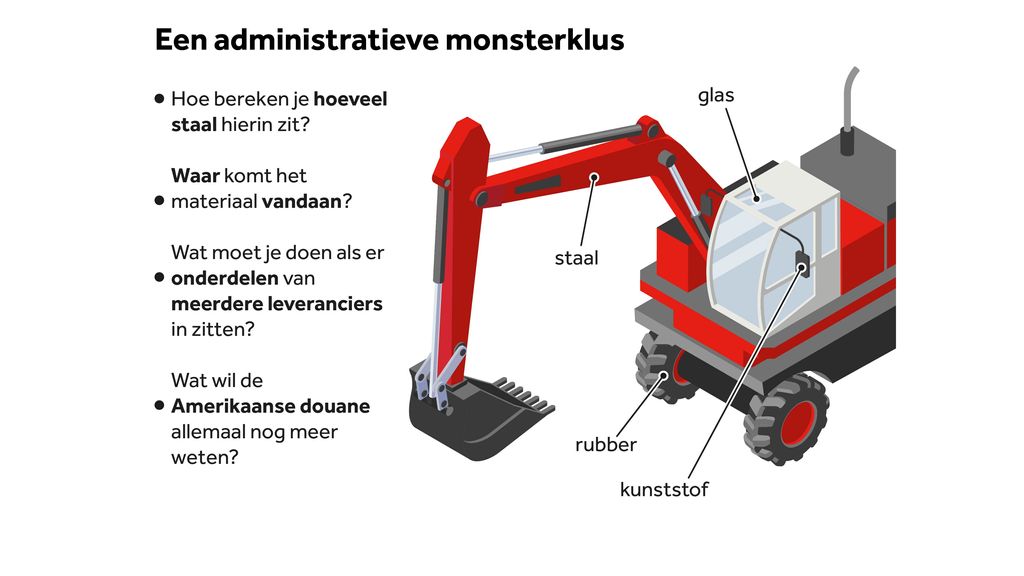 Neem bijvoorbeeld een bulldozer. Die staat sinds kort ook op de lijst. Bedrijven moeten nu aangeven hoeveel staal en aluminium erin zit, wat het heeft gekost en waar het vandaan komt. In de huidige handelswereld zijn dit lastig te beantwoorden vragen voor veel bedrijven. Onderdelen van een bulldozer kunnen van tientallen verschillende landen en bedrijven komen.
