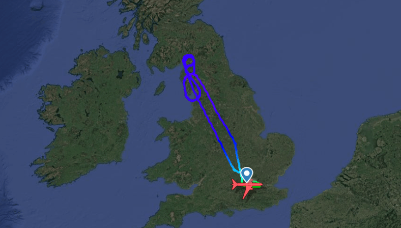 Op dat moment bevond het toestel zich bij de grens tussen Engeland en Schotland. De 777 maakte meerdere rondjes om brandstof te lozen. Daarna keerde de machine terug richting de luchthaven van vertrek. Daar landde het vliegtuig twee uur na vertrek. De United-vlucht werd vervolgens geannuleerd.