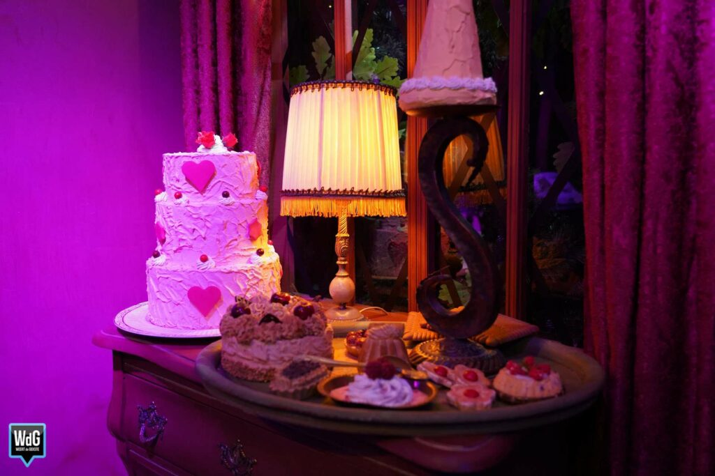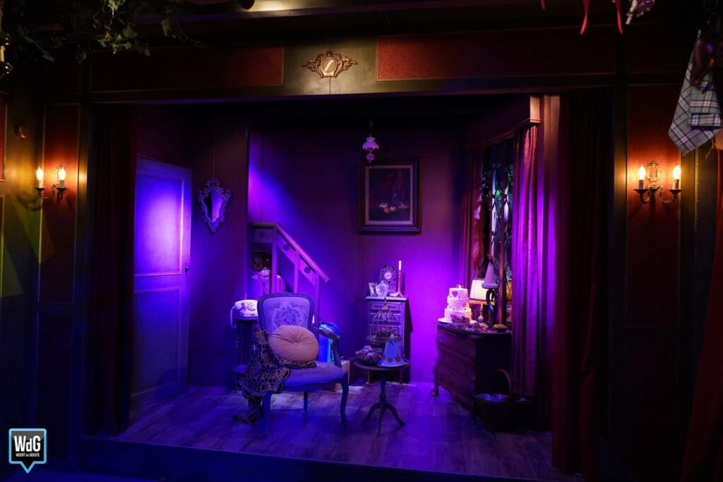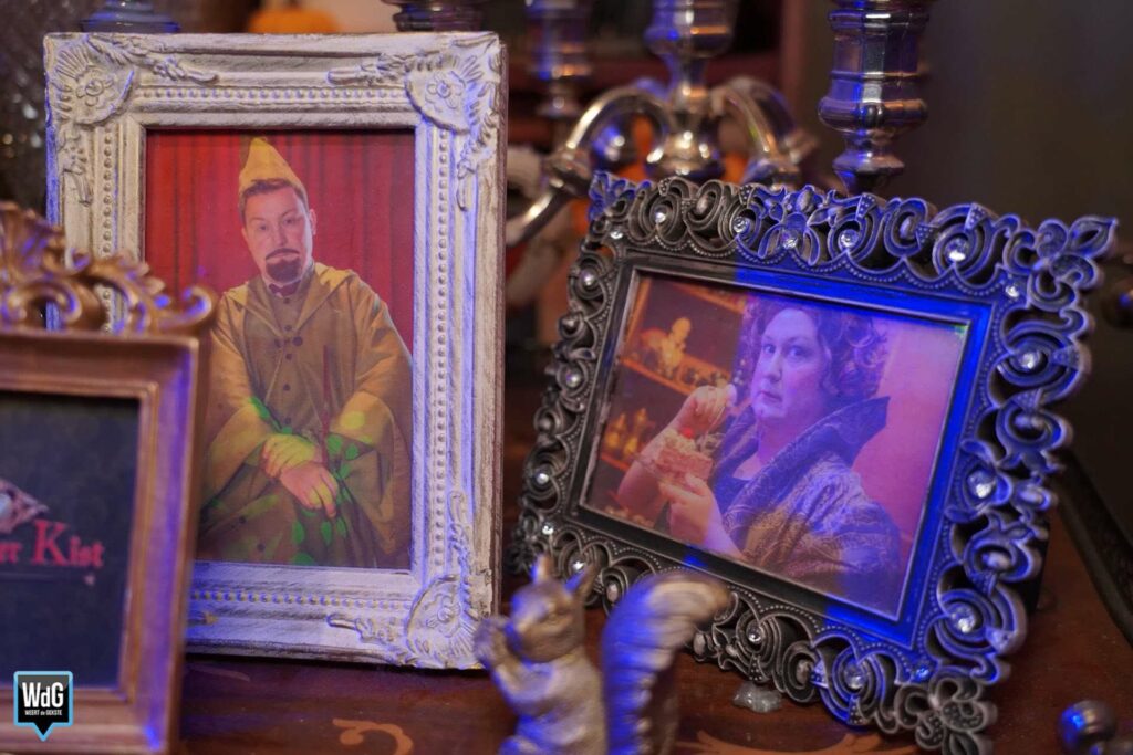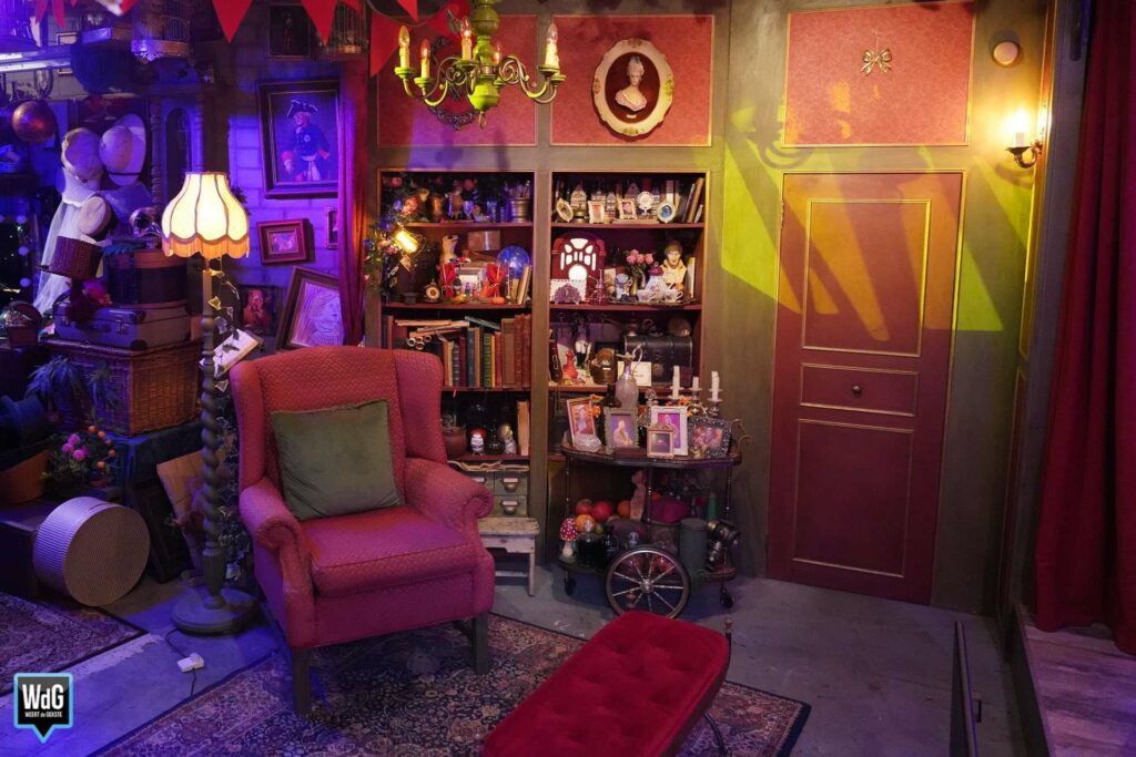 Alle attributen in het theater van Willem hebben een eigen verhaal. Zo is er de rode zetel waarop de theatermaker zijn verhaal doet. “Deze stoel heeft nog als rekwisiet gediend in een Sinterklaasfilm. Grote kindervriend Bram van der Vlugt heeft hier nog op gezeten.” Ieder vak in de boekenkast staat vol met attributen die horen bij de verschillende personages die Willem speelt. Het woordenboek dat op een houten standaard ligt, is geopend op de pagina met als eerste woord ‘Magisch’. “Niet geheel toevallig,” zo laat de theatermaker ons weten.