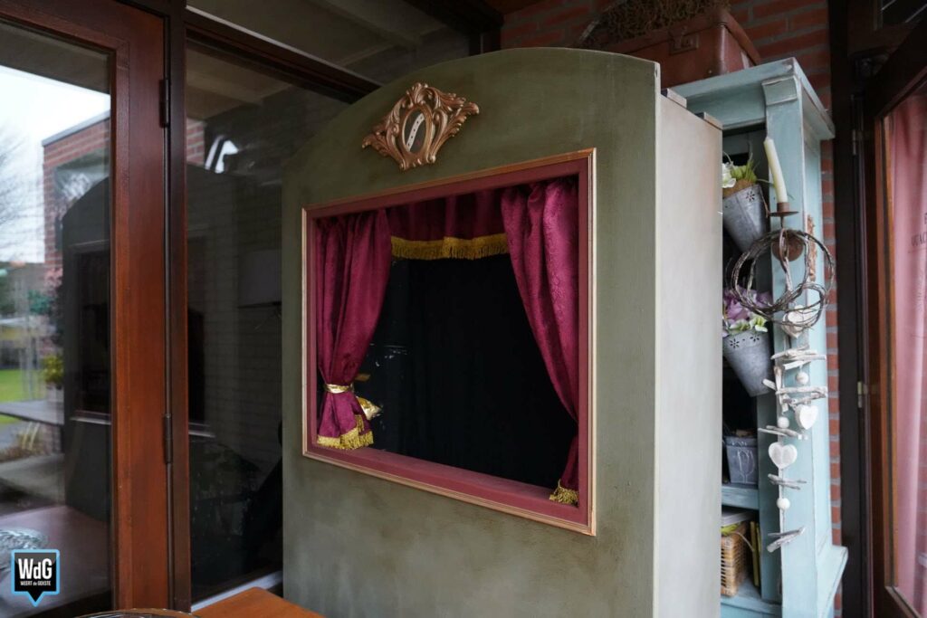 Willem ontvangt ons in zijn sfeervolle mini-theater in Altweerterheide. Bij binnenkomst zijn de spots al aan en horen we subtiel op de achtergrond theatermuziek. De voormalige garage staat vol met attributen die hij als theatermaker de afgelopen jaren heeft verzameld. “Het bestaat bijna tien jaar. Het is heel kaal begonnen en inmiddels staat het vol met allemaal leuke theaterkist-spullen die ik gebruik in mijn theatervoorstellingen.”