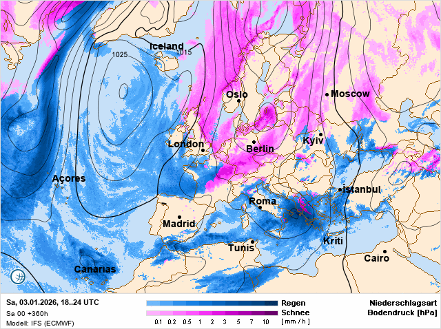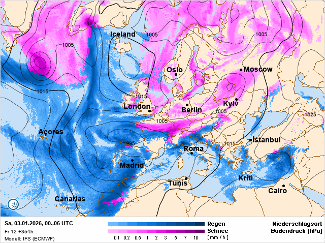En GFS 3 januari toont zo’n mooi horizontaal sneeuwfront dat in dit geval over Parijs uitsneeuwt maar dat kan net zo goed Brussel of Amsterdam zijn. In elk geval gewoon een mooie soepzooi waarin van alles kan gebeuren.