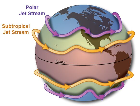 De straalstromen die op aarde voorkomen. De subtropische straalstroom bevindt zich grofweg boven de Sahara op het noordelijk halfrond, terwijl de polaire straalstroom grofweg boven West-Europa hangt (bron: NOAA).