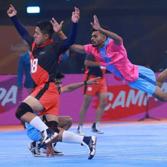 Op de bodem van een zwembad streden deelnemers om de winst. De pionnen zitten met magneetjes aan het bord vast. Zo komen ze niet omhoog drijven.