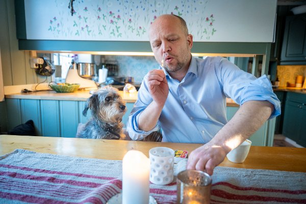 Trygve Slagsvold Vedum avbildet hjemme på Ilseng sammen med gårdshunden Molly tidligere i år.