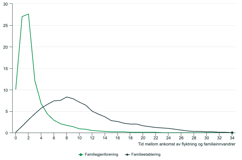 De fleste familieetablerere (typisk gjennom henteekteskap) til flyktninger her skjer en god del år etter at flyktningen selv ble bosatt i landet. Derimot vil familiegjenforeninger (familierelasjonen eksisterte før flyktningen innvandret til Norge) typisk skje innen få år. Ifølge SSB finner at over 80 prosent av gjenforeningene sted skjer i løpet av de fire første årene, og aller flest i ett til to år.