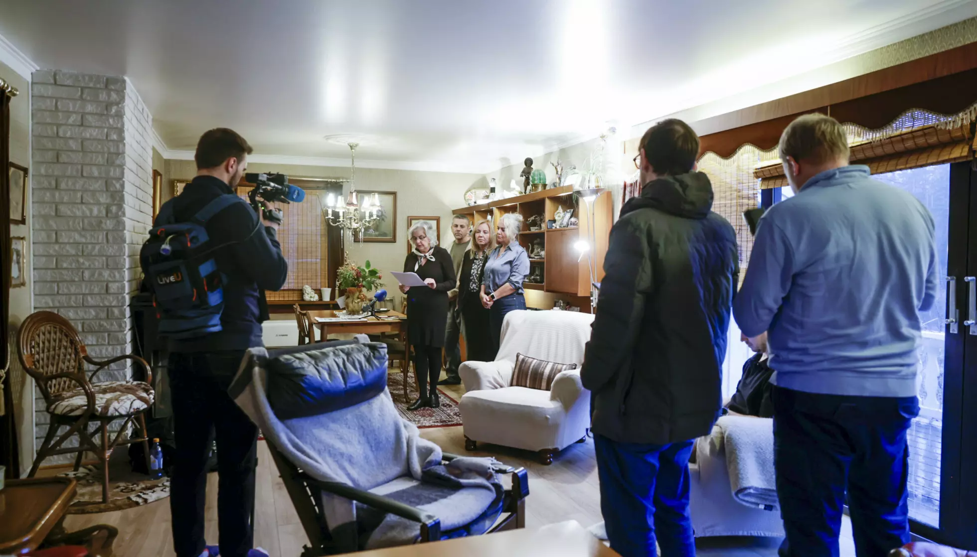 ANNERLEDES KAFFEBESØK: Sammen med flere andre journalister sitter Dagbladets reportere hjemme hos familien Mihailas barndomshjem. Foto: Jørn H. Moen