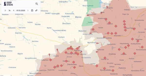 FÅ VEIER: Det pågår kamper rundt hele Myrnohrad. Ifølge de ukrainske analytikerne DeepStateMap sitt kart er ingen veier inn og ut av byen trygge akkurat nå.