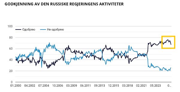 Levadas bakgrunnstall viser at det stadig er et skille mellom de som stoler på fjernsyn som informasjonskilde, og de som heller tyr til sosiale medier og russiske militærbloggere på Telegram. TV-seerne er i langt større grad positive til russiske myndigheter og landets utvikling.