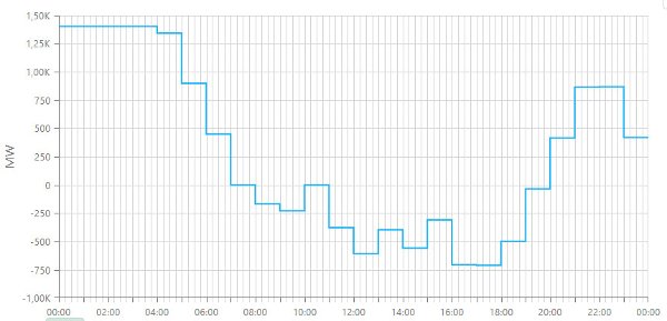 Fredagens flyt av strøm gjennom strømkabelen til England. Negative tall betyr at det importeres strøm.