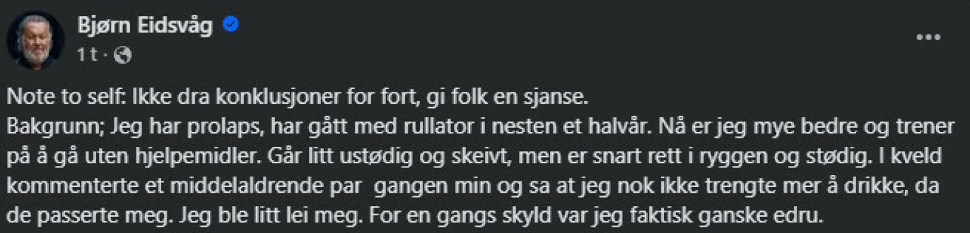 Videre i Facebook-innlegget hevder Eidsvåg at et par kommentere den noe ustø gangen hans: