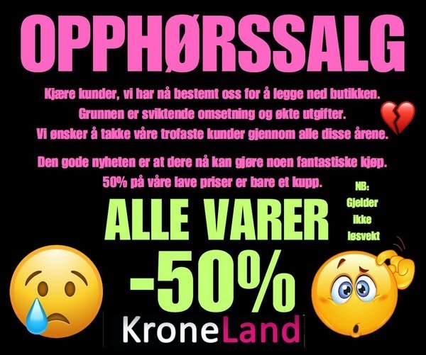 OPPHØRSSALG: Dette bildet ble lagt ut på Kronelands Facebook i januar i fjor. Men de har holdt åpent siden den gang. Nå er det nytt opphørssalg.