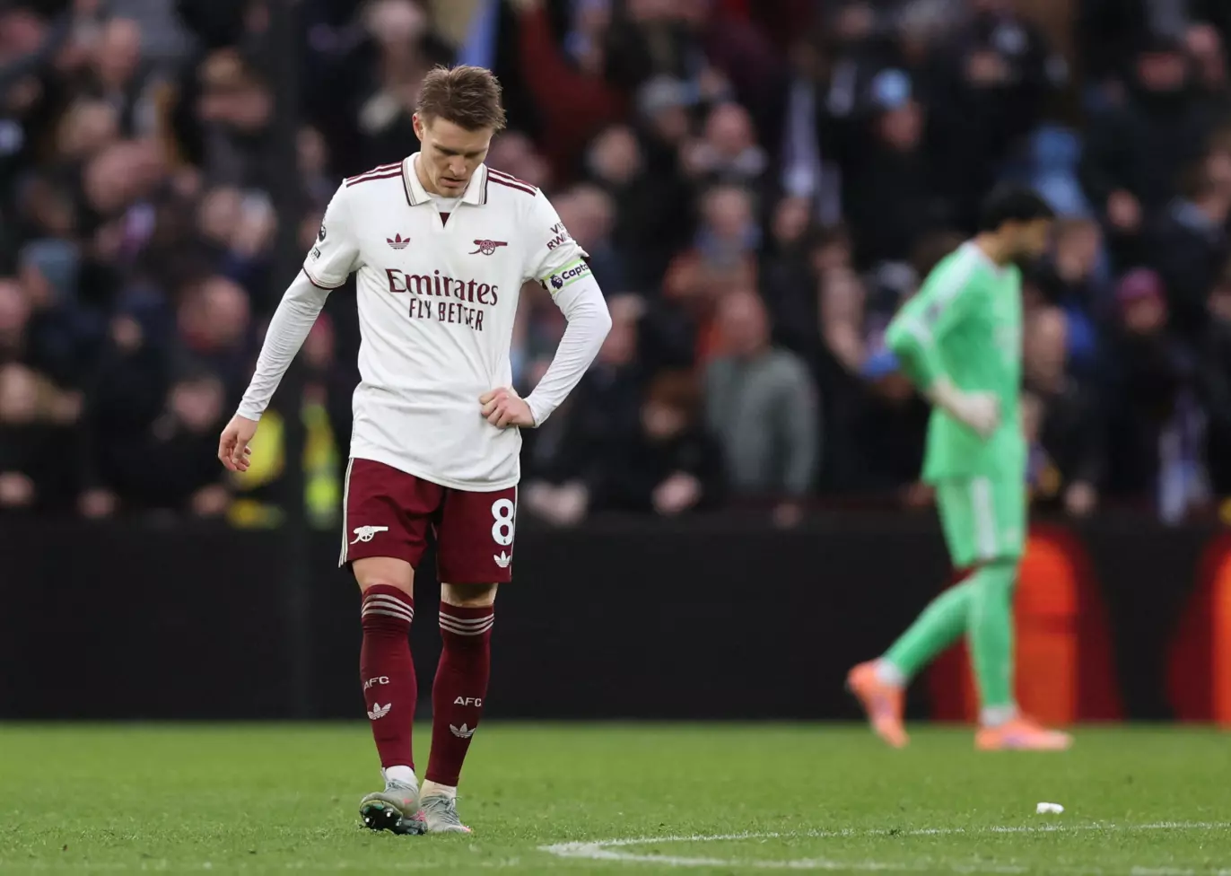 SKUFFET: Martin Ødegaard etter at Arsenal tapte 2-1 på overtid mot Aston Villa. Nå er det full fyr i tittelkampen i Premier League. Foto: REUTERS/David Klein / NTB