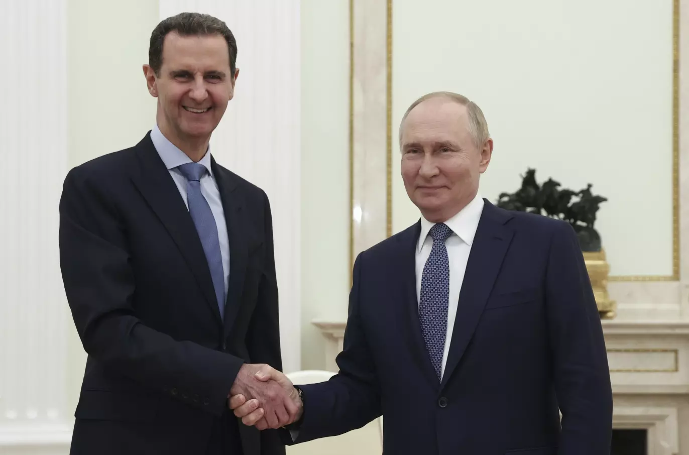 ALLIERTE: Bashar al-Assad (t.v.) håndhilser på Russlands president Vladimir Putin i Moskva sommeren 2024, rundt et halvt år før den syriske diktatoren måtte flykte til Moskva etter å ha blitt styrtet. Foto: Valerij Sjarifulin / Sputnik / Kreml Pool Photo / AP / NTB