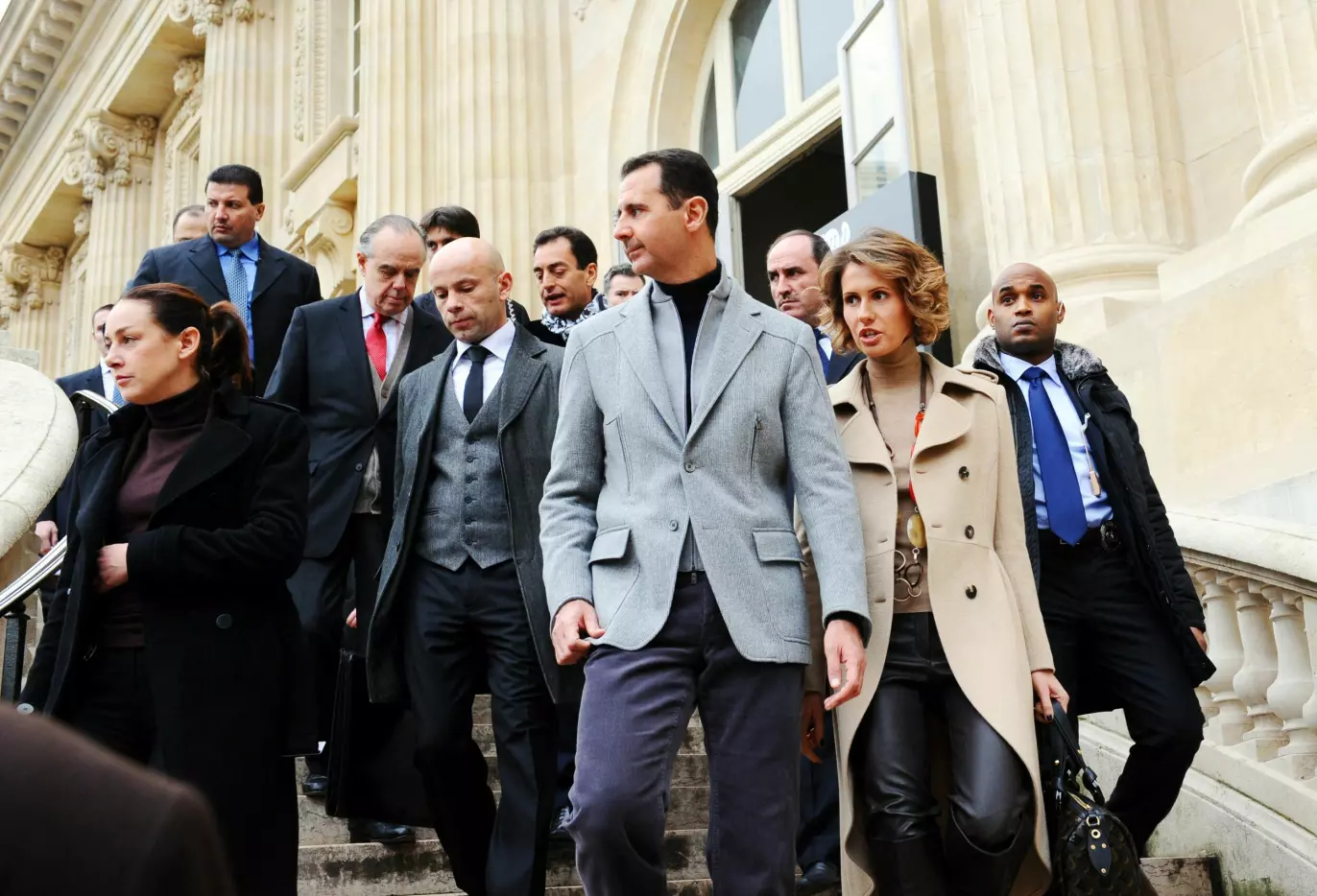 KVINNEKAMP: Bashar al-Assad, hans kone Asma og den franske kulturministeren Frédéric Mitterrand forlater Grand Palais etter et besøk på en utstilling i Paris, 11. desember 2010. På den tida ble Asma sett på som en forkjemper for kvinners rettigheter. Foto: Miguel Medina / AFP / NTB