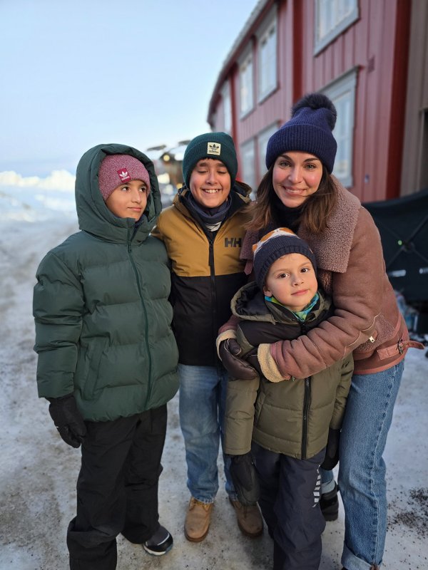 Matheo med brødrene i serien og hovedrolleinnhaver Ida Elise Broch.