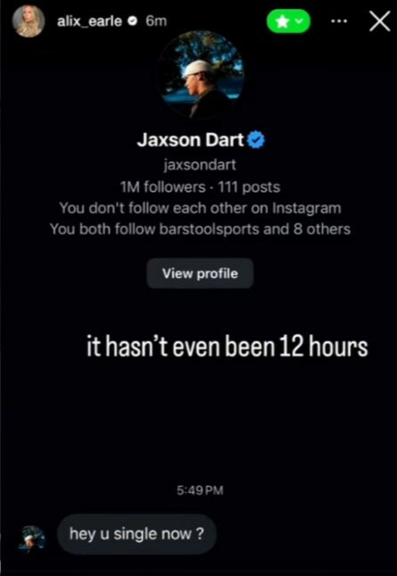 I den angivelige meldingen skrev den offisielle Instagram-kontoen til NFL-spilleren Jaxson Dart (22): «Hey, er du singel nå?»